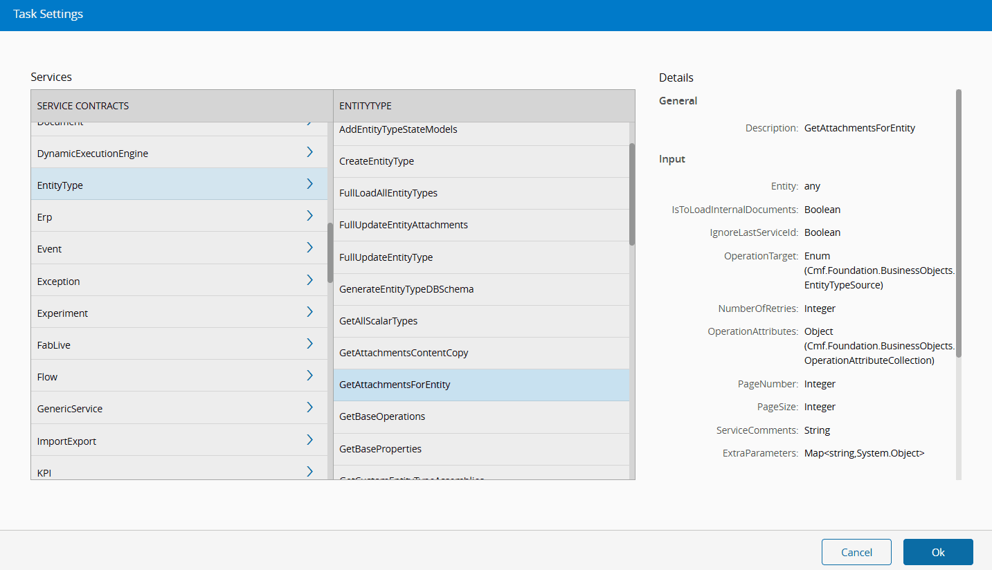 4. In the Service Call task, select the Settings button and choose the Service Contracts: EntityType > GetAttachmentsForEntity.