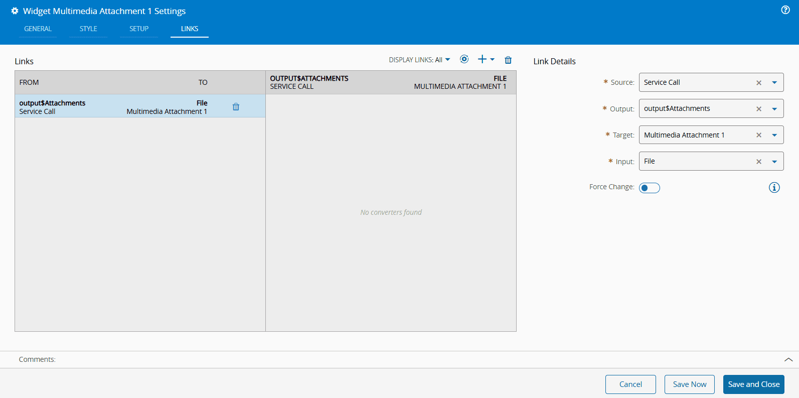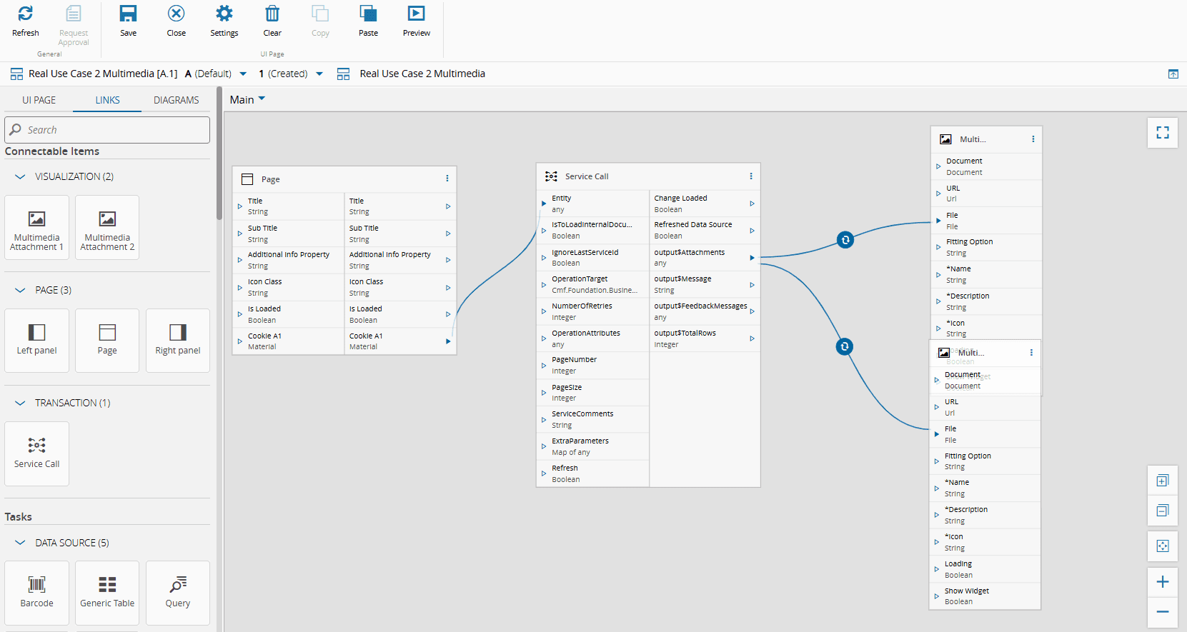 7. Connect the Multimedia widgets to the Service Call task. Use an Any To Any Property converter and define the Key Static attribute based on the attachment order. For instance, set Key Static to 0 to display the first attachment.