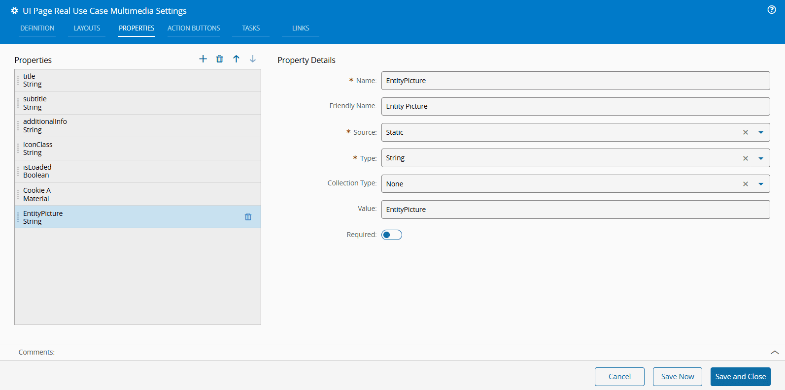 2. In the UI Page, select the Settings button and add two new Properties: Cookie A1 and Entity Picture.