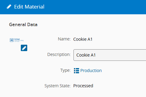 1. Add an image to any MES entity. In this example, an image was added to a Material entity named Cookie A1 by editing the Material and pressing the icon beneath the entity icon. For more information, see the Edit Entity section.