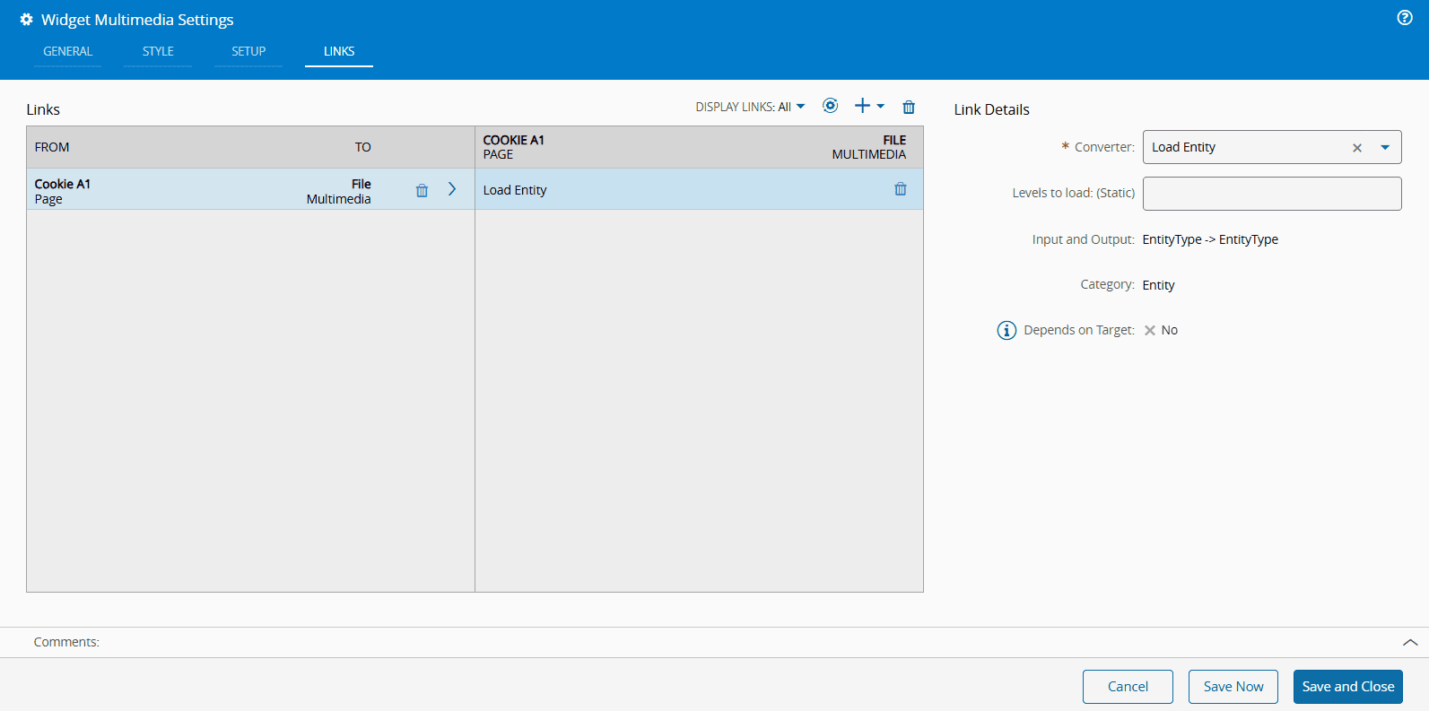 4. Add two converters to the previous link: a Load Entity and an Any to Any Property. For the Any to Any Property converter, set the Key Property to EntityPicture.