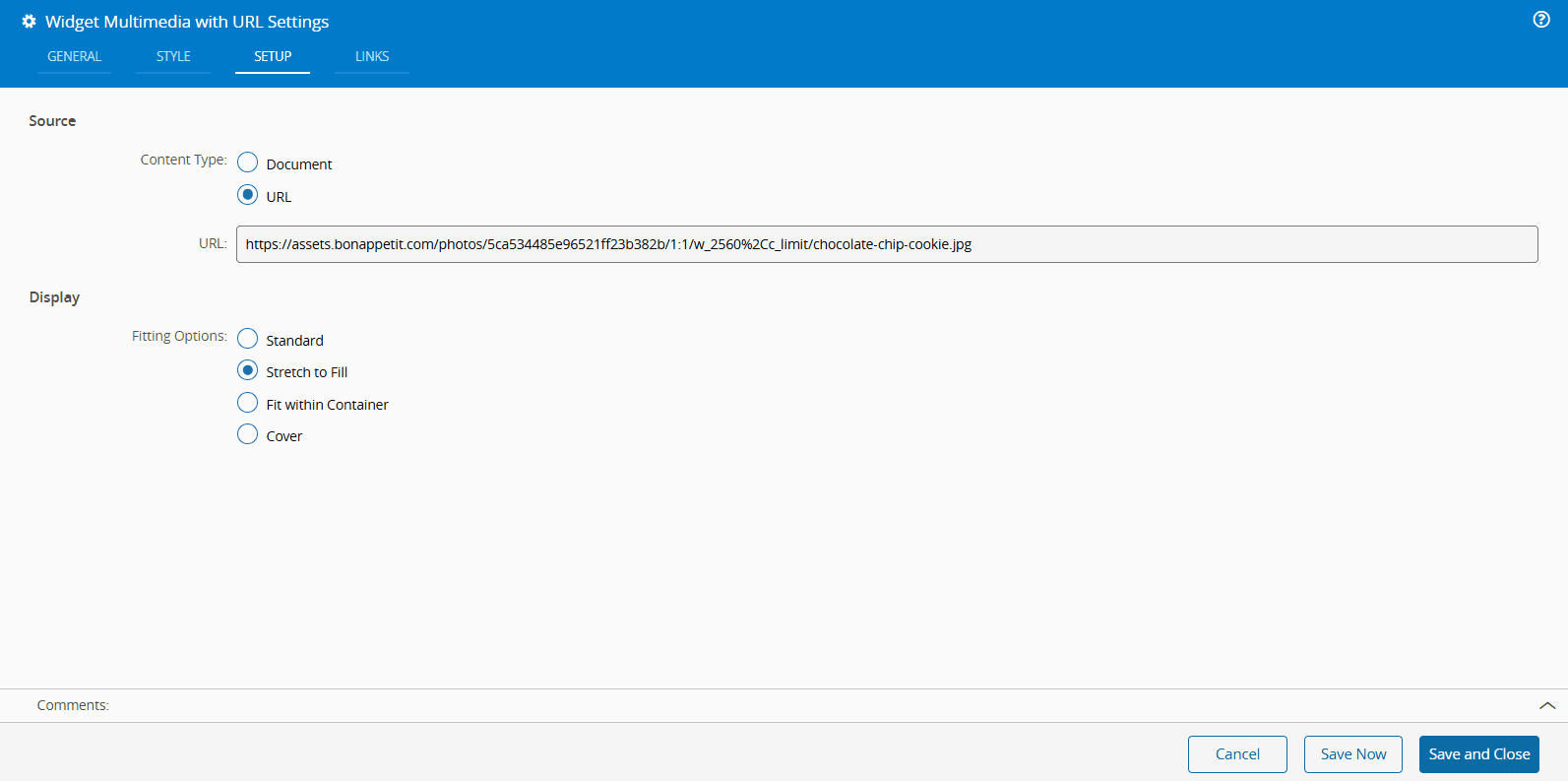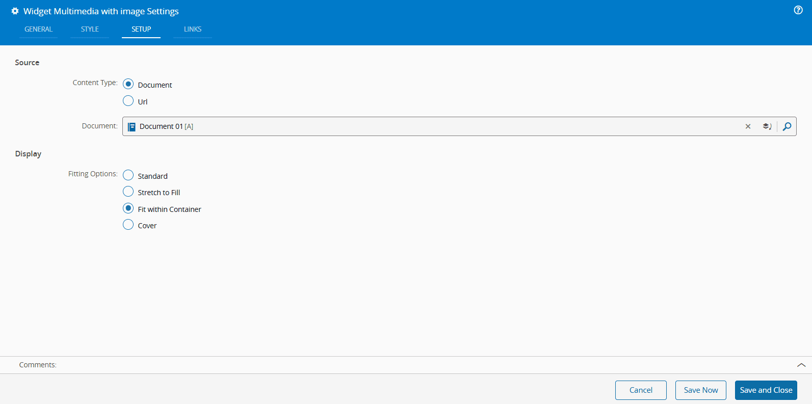 2. In the Setup tab, specify the Document to be displayed. You can select the Source as either a Document or a Url. If the chosen Source contains video or image files, you can customize their display using the available Fitting Options: