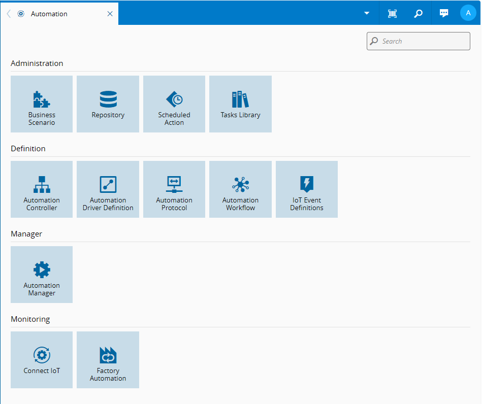 The Automation menu provides a centralized hub for managing all automation aspects in Critical Manufacturing MES, including equipment integration, workflow orchestration, and process automation.