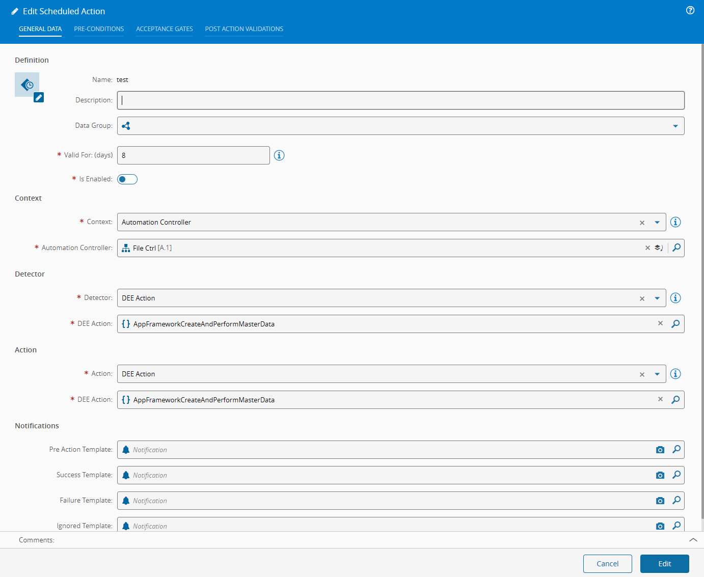 The Edit Scheduled Action wizard has the same structure as the Create Definition wizard, but displays the current configuration.
