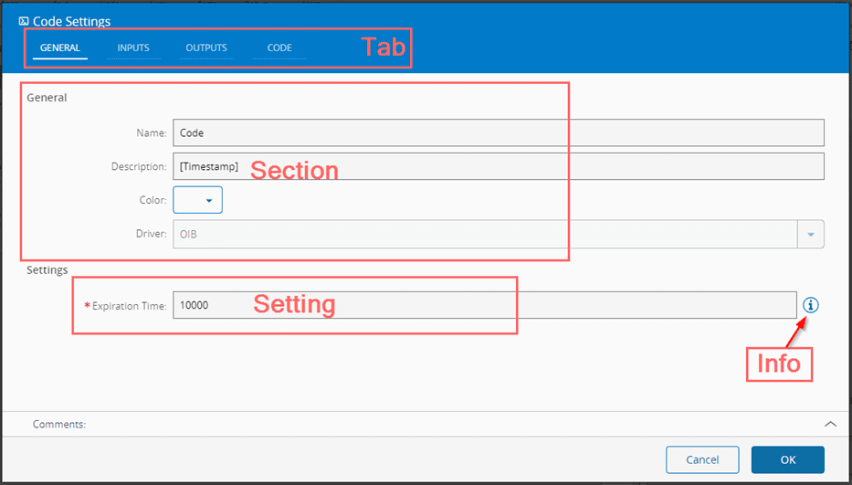 - Tabs: "General", "Inputs", "Outputs", and "Code"