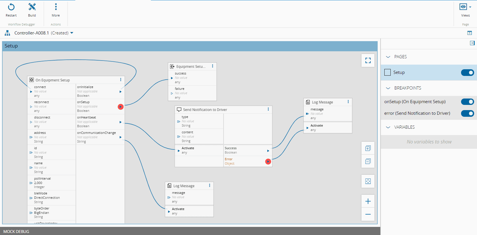 Starts a debug session without actually connecting to an instance, focusing on the workflow execution itself. A Restart button is available so that the workflow can be put in the starting state once again.