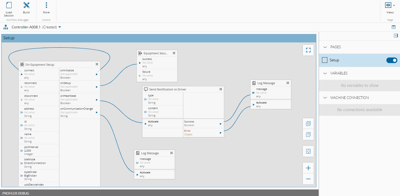 This mode will attach a profiler that will record all the variables, call stack and sequence and memory usage of the workflow throughout its execution. This profiler session can then be downloaded and examined offline or reloaded afterwards to the debugging panel. As in the Remote Debug option, a Machine Connection panel is available to select the instance to which the debugger should connect. Also, a Load Session button is available for the user to load a previously saved session, as described above.
