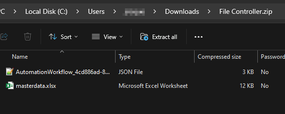 The masterdata will be exported as an importable ZIP file. It will contain a masterdata in XLSX format with all the entities and all the Automation Workflows as json files.