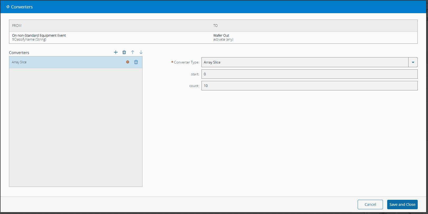 The arrayslice converter receives an array of any type and removes any position of the array that is not in the given interval. It receives a start position and a count input. The transformed array will be the original array from the position given by the start position input, until it has added the number of positions equal to the count input number. If count is 0 it will assume that count is the length of the array. It uses the javascript .slice() function.