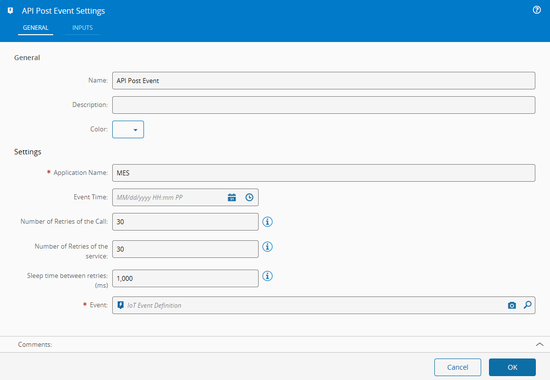 Event String IoT Event Definition full name ({folder_path}\{event_name}) to which post MES request should be performed