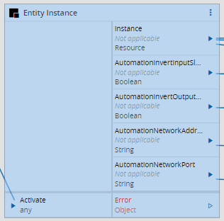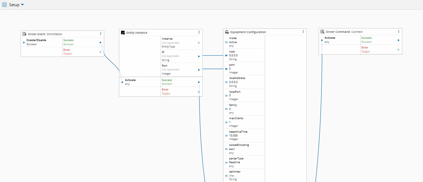 In a typical configuration, the Entity Instance is used along with the Driver Event OnInitialize, Equipment Configuration and Driver Command Connect tasks.