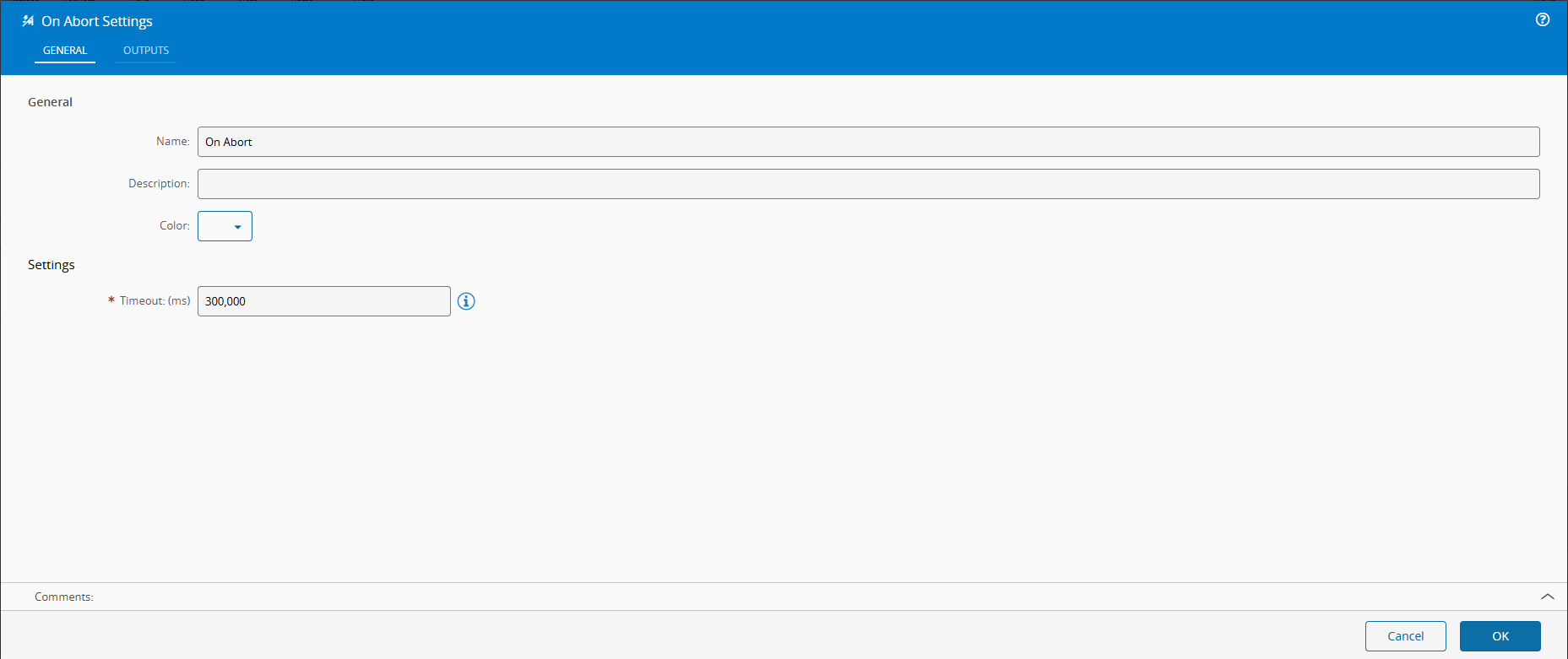 | Timeout | Integer | 300000 | Timeout for the Abort process. The default is 5 minutes (300000 ms) and 0 means there's no timeout. |