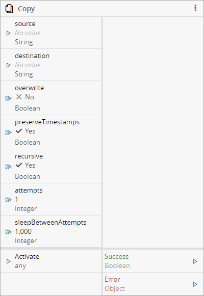 | Recursive | Boolean | True | If the source is a directory, should the subdirectories be copied as well | |