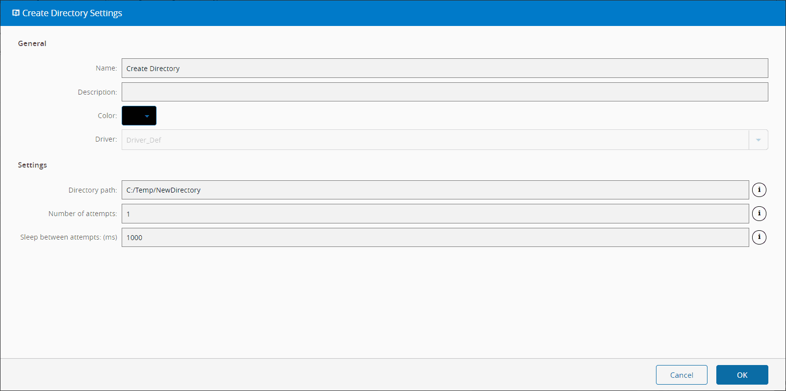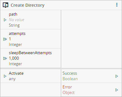 Upon activation, will send a CreateDirectory command to the driver where it will try to create a new directory in the path location. If it fails, will retry attempts times, waiting sleepBetweenAttemptsmilliseconds each time.