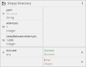 Upon activation, will send a EmptyDirectory command to the driver where it will try to delete all files and subdirectories of path location. If it fails, will retry attempts times, waiting sleepBetweenAttempts milliseconds each time.