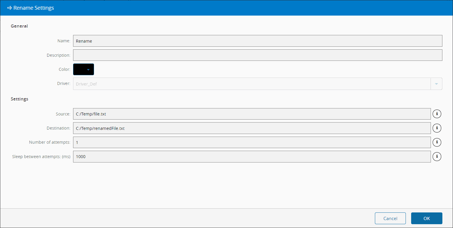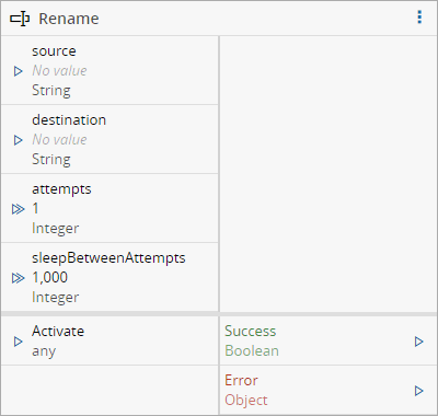 Upon activation, will send a Rename command to the driver where it will try to rename the source location (file or directory) into the destination location. If it fails, will retry attemptstimes, waiting sleepBetweenAttempts milliseconds each time.