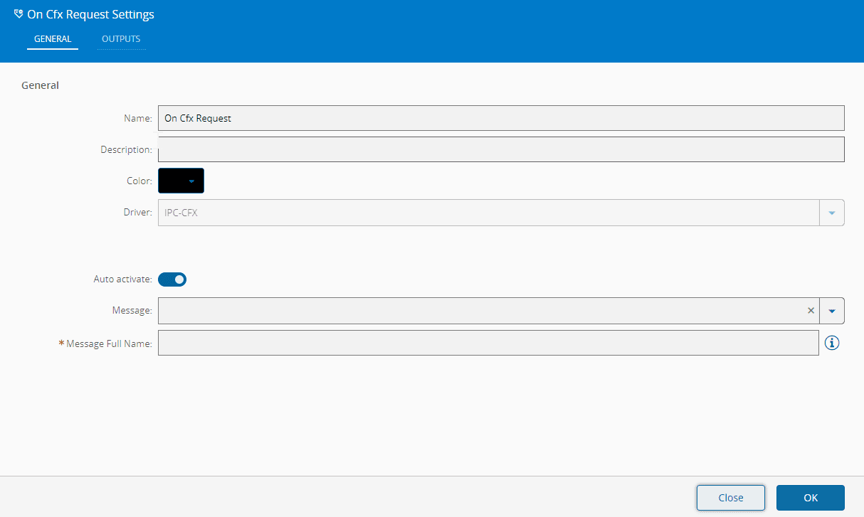 This Task receives request CFX messages of a specific type, which can be configured in the Task's settings.