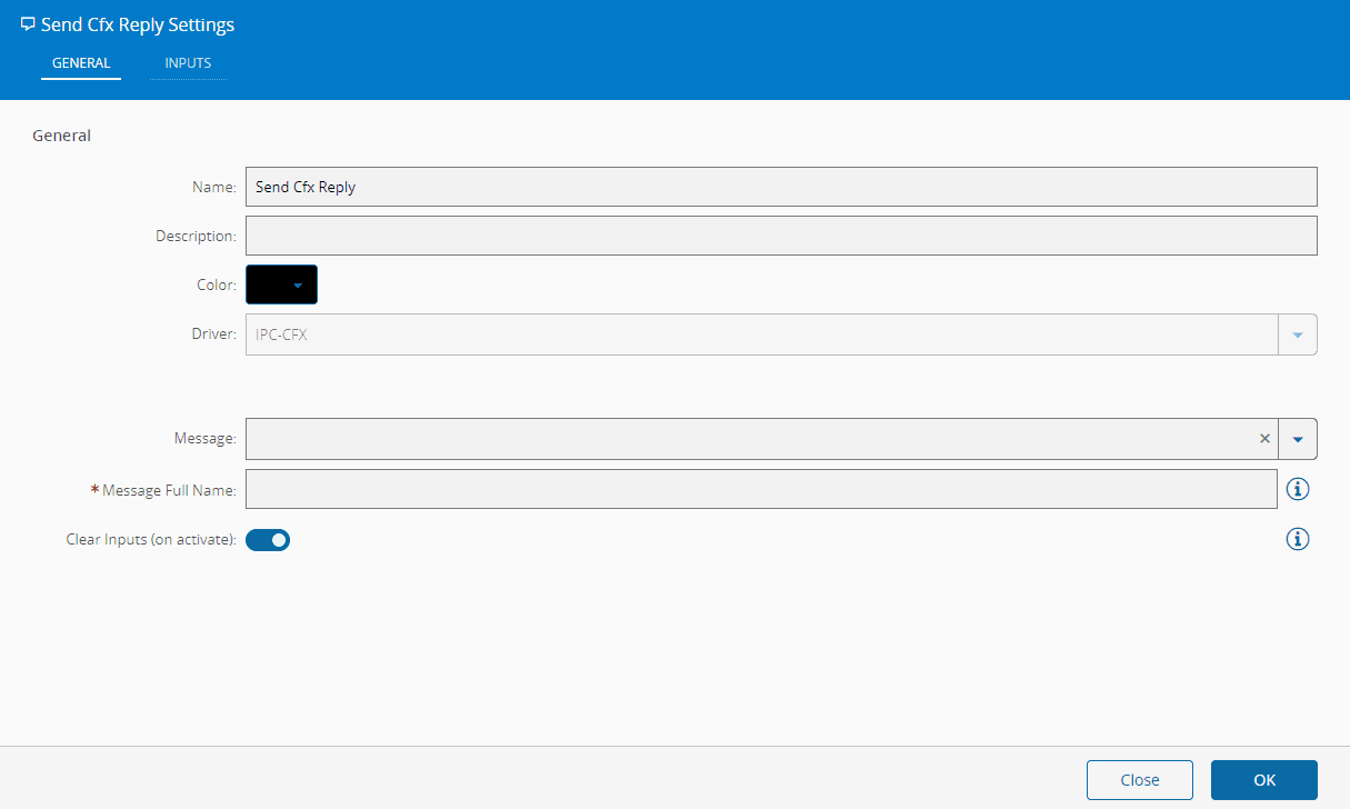 This Task sends reply CFX messages of a specific type, which can be configured in the Task's settings.