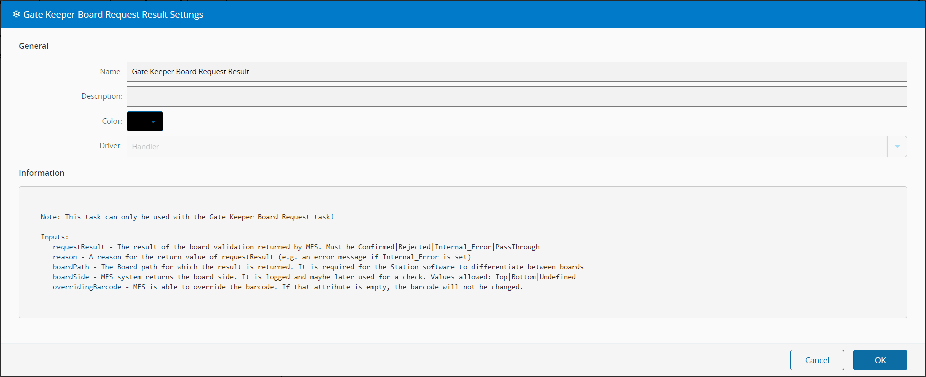 requestResult String The result of the board validation returned by MES. Must be one of these options: