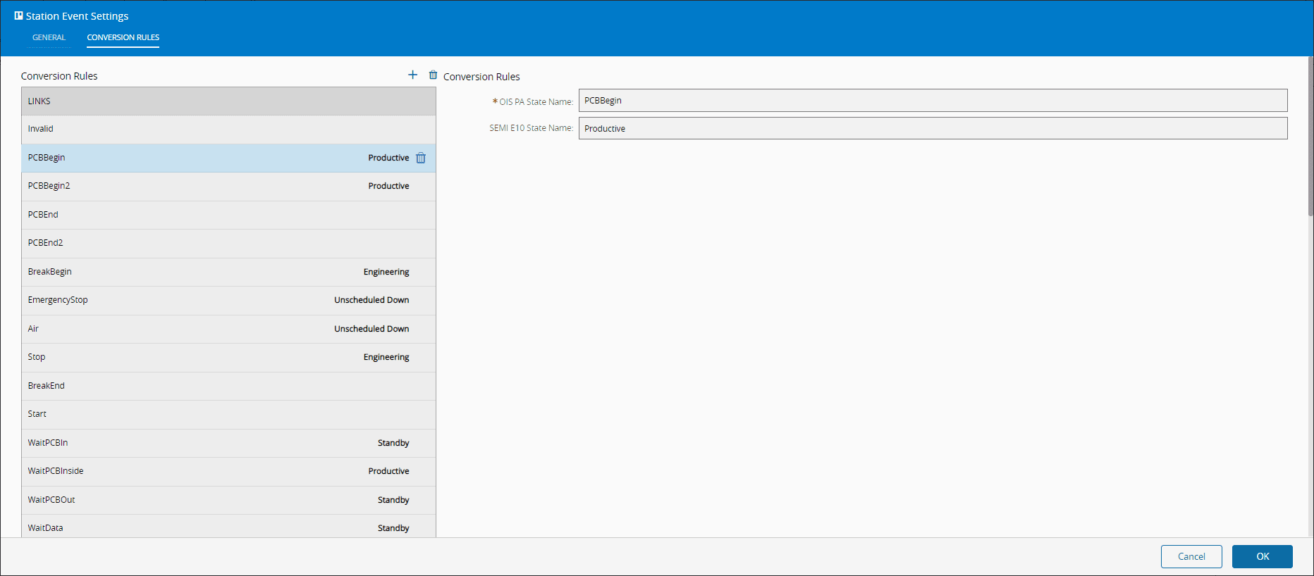 By default, there is already a match between some OIS PA States and SEMI E10 States, pre configured in the task. The user is free to add more and to change the one's pre configured.