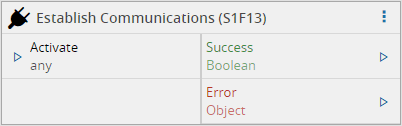 Upon activation, will send an S1F13 (Establish Communications) message to the driver of the equipment. If the reply matches what was expected in the correct path and with the correct success code, the task will emit a value true on the Success output. In case of the task , for some reason, is not able send the message or if it receives an unexpected reply, an Error is emitted.