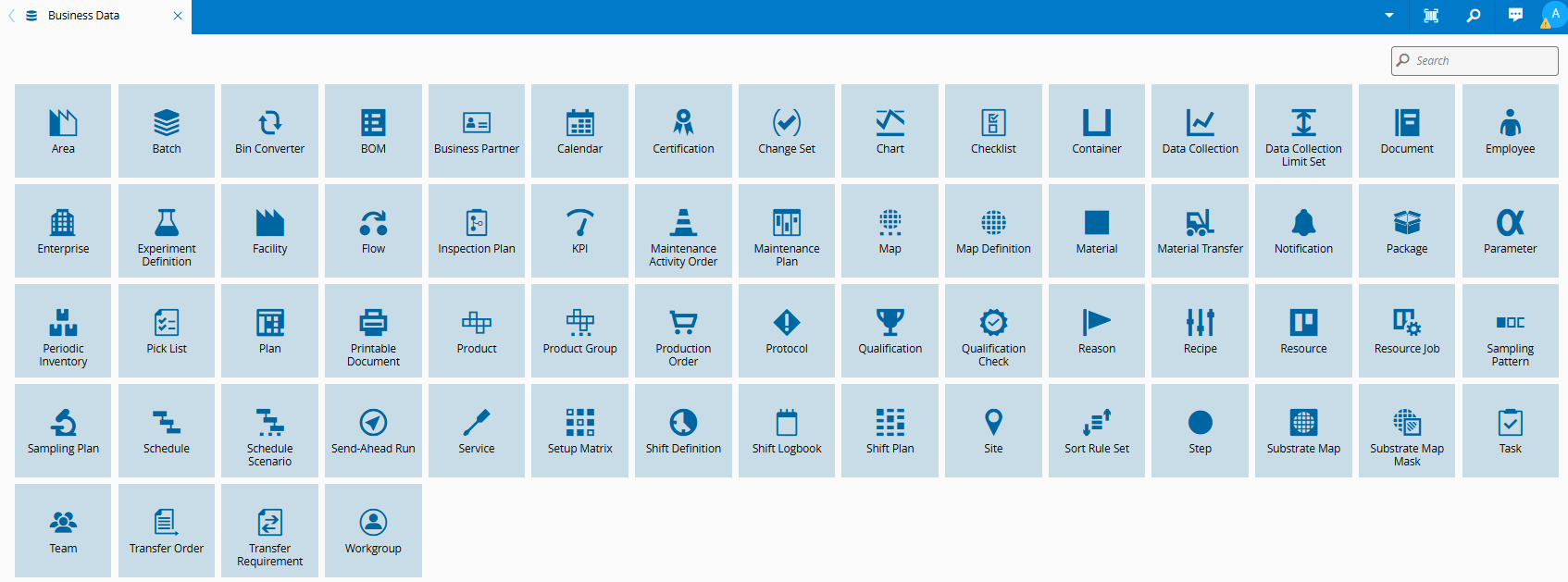 The different entities are displayed by selecting the Business Data menu. It is also possible to target specific entities by using the Search box.
