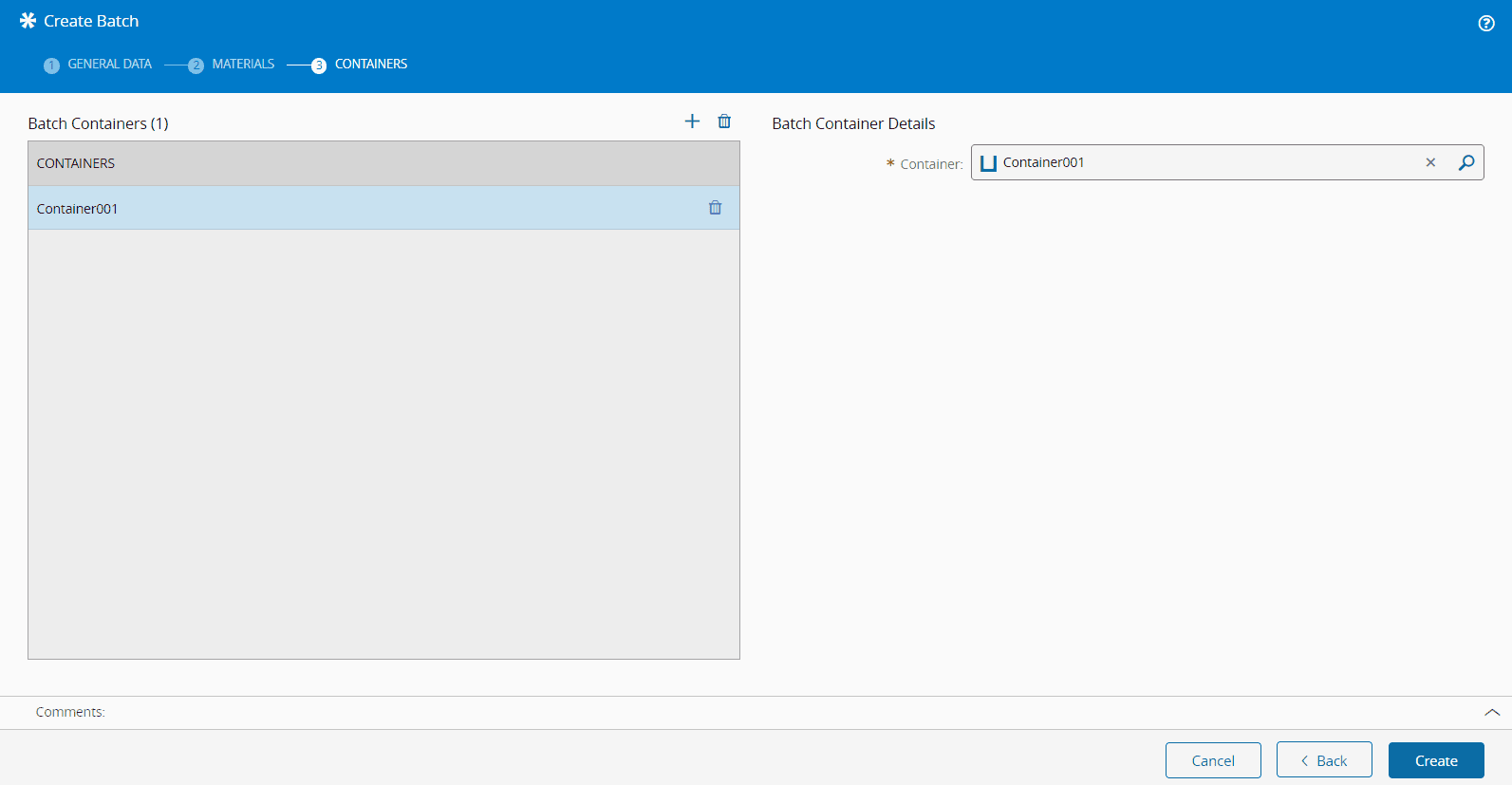 - Containers can only be added to the Batch if a Batch Container Type is defined. All added Containers must match that type, be in the same Facility as the Batch Resource, be Active, and non-templates.