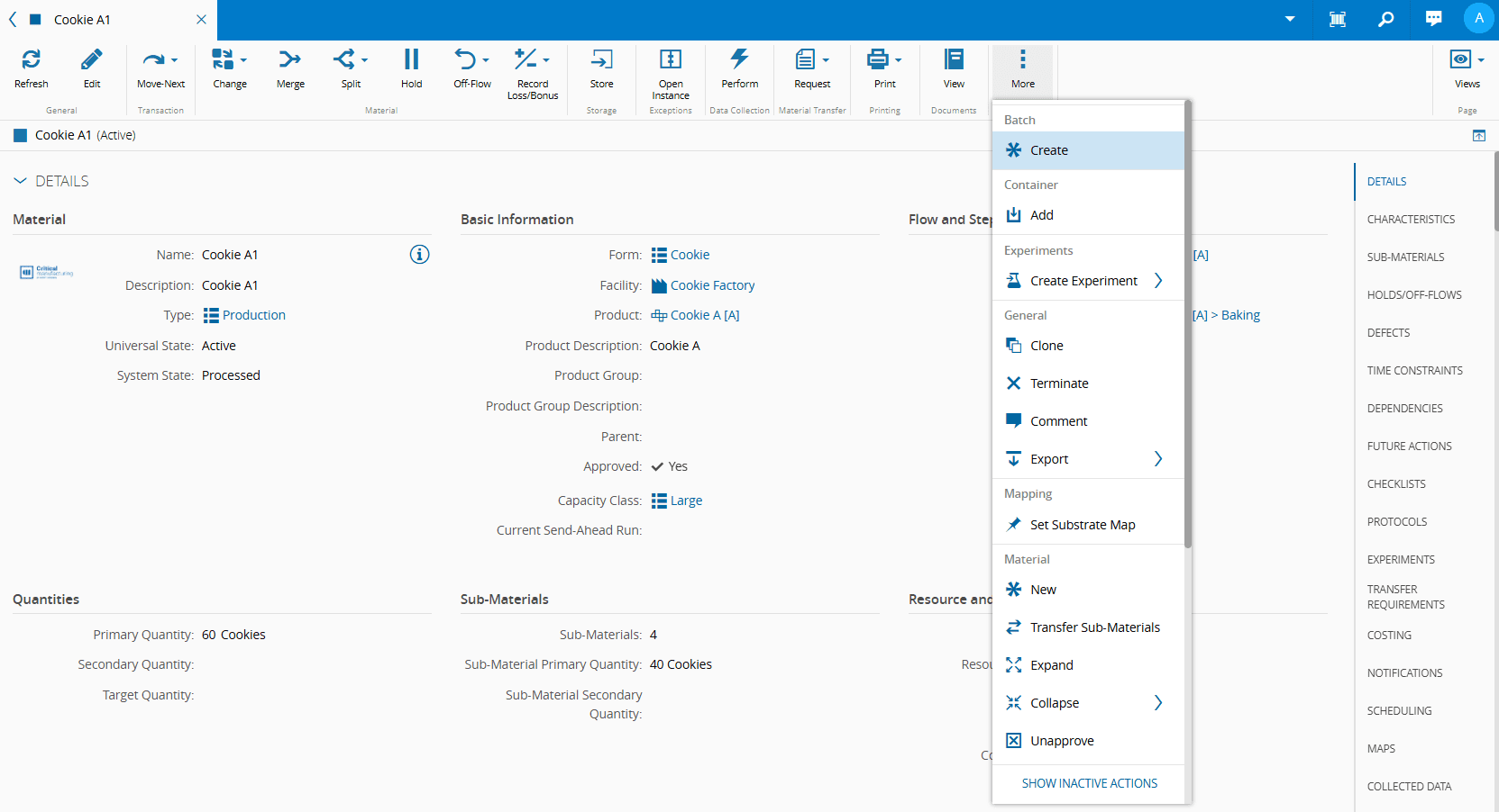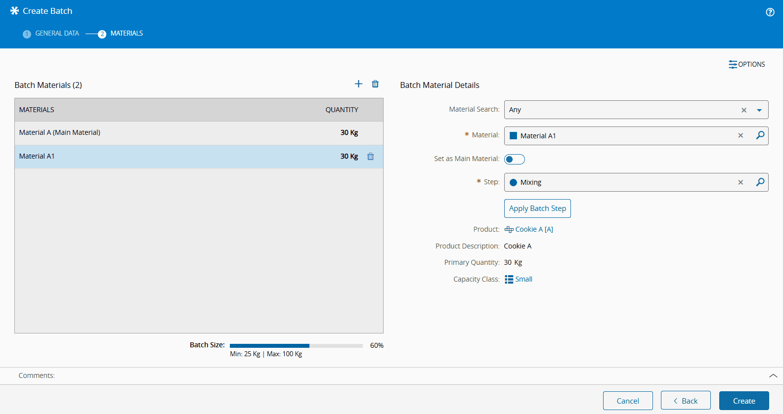 When creating a Batch from the Material page, the system automatically pre-selects the chosen Material in Step 2 of the wizard.