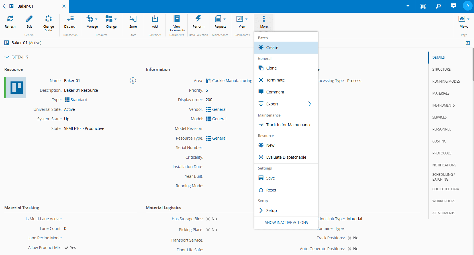 You can create a Batch from the Batch entity in the Business Data menu by selecting the New button. You can also create a Batch from the Material page or from the Resource Details View or Resource View, as shown below.