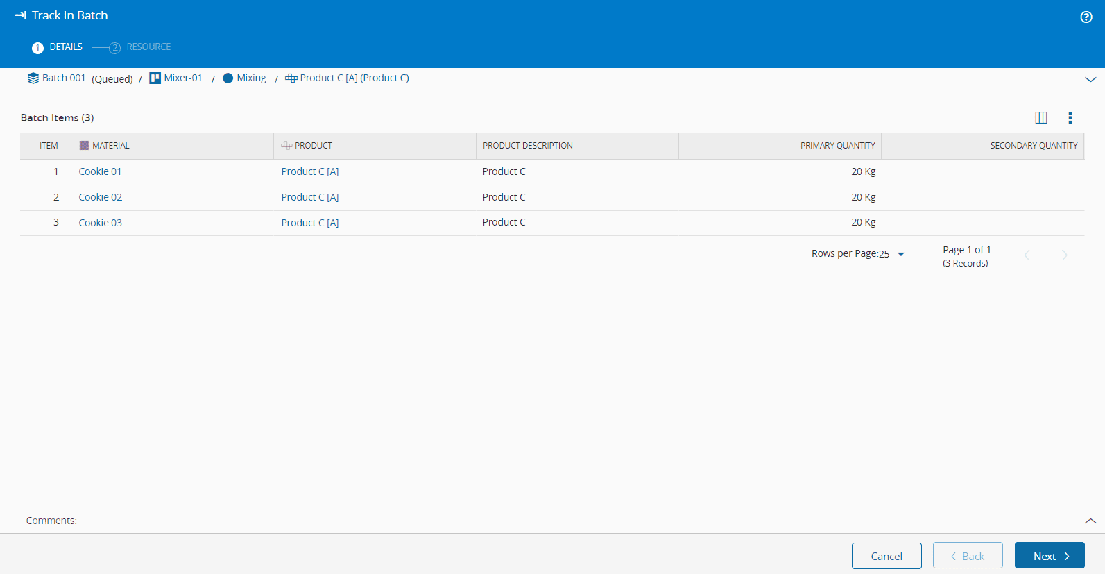- All Batch Materials must be Queued at the Batch Step, must have the same Primary Units as the Batch units and must be in the same Facility as the Batch Facility.