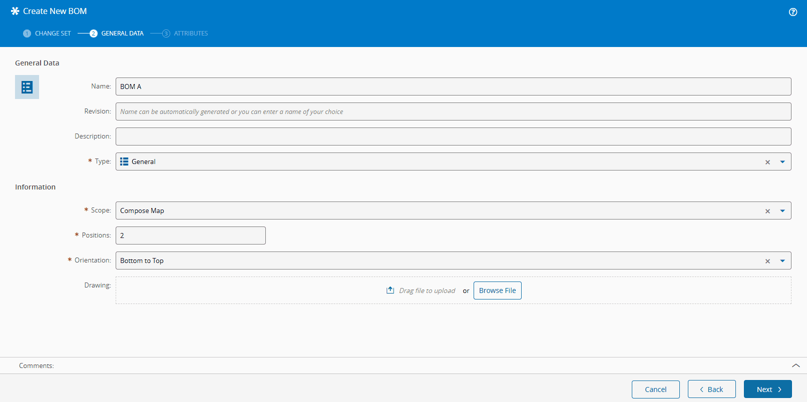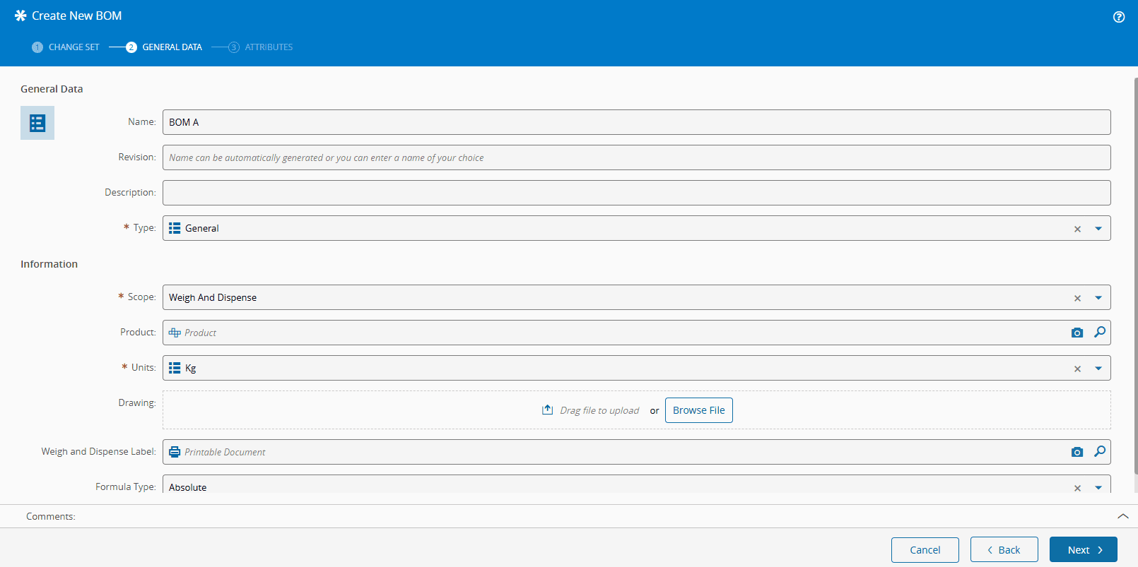 - Select the BOM type. The list of possible values is taken from the BOMType Lookup Table.