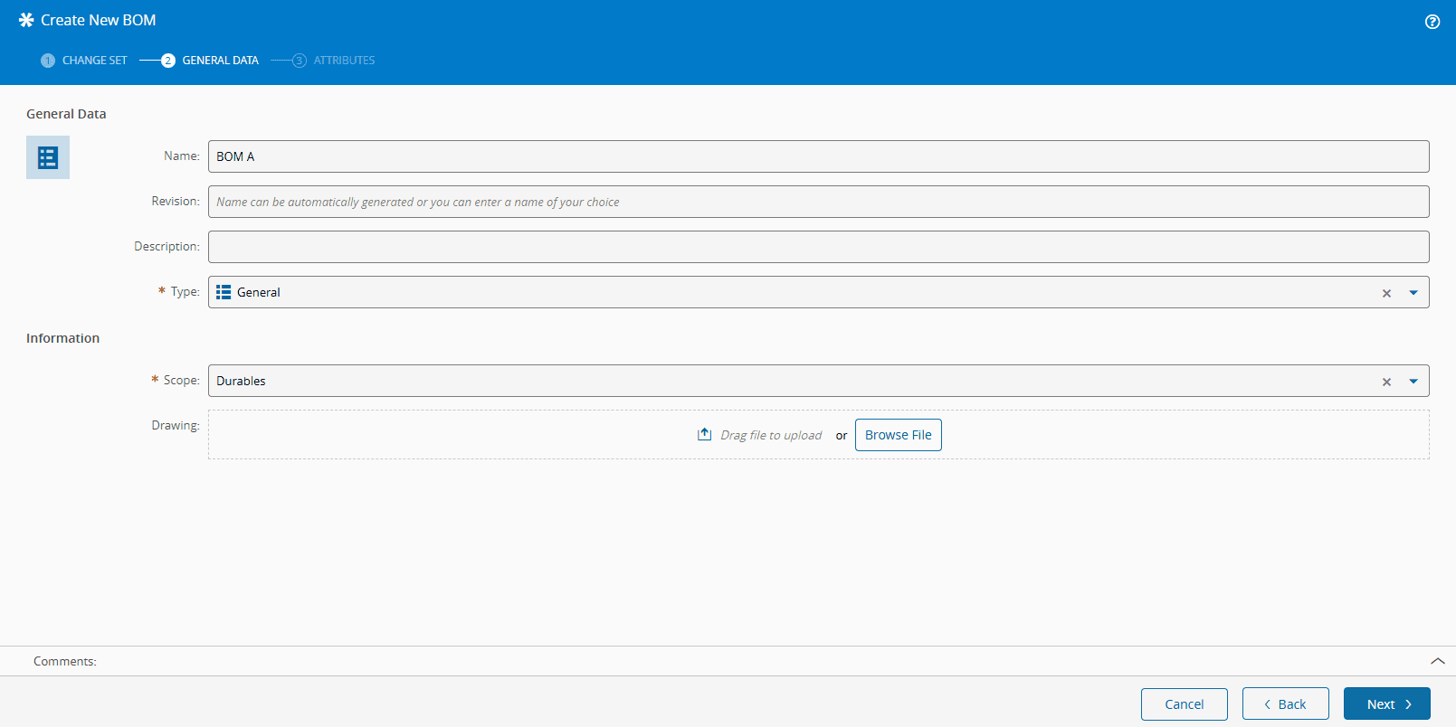 Drawing - optionally, specify a BOM drawing (associated with the versioned portion). Select the drawing to import by dragging a file from the file explorer or by selecting the Browse Files button and selecting a file manually. File information will be displayed on screen after the file is loaded and analyzed by the system. Selecting the button on the right hand side of the entry will remove the file from the import queue.