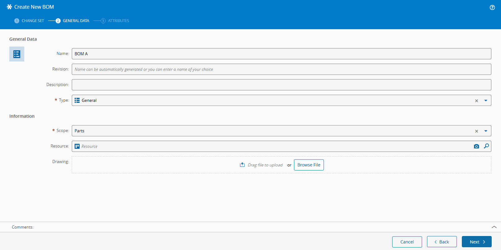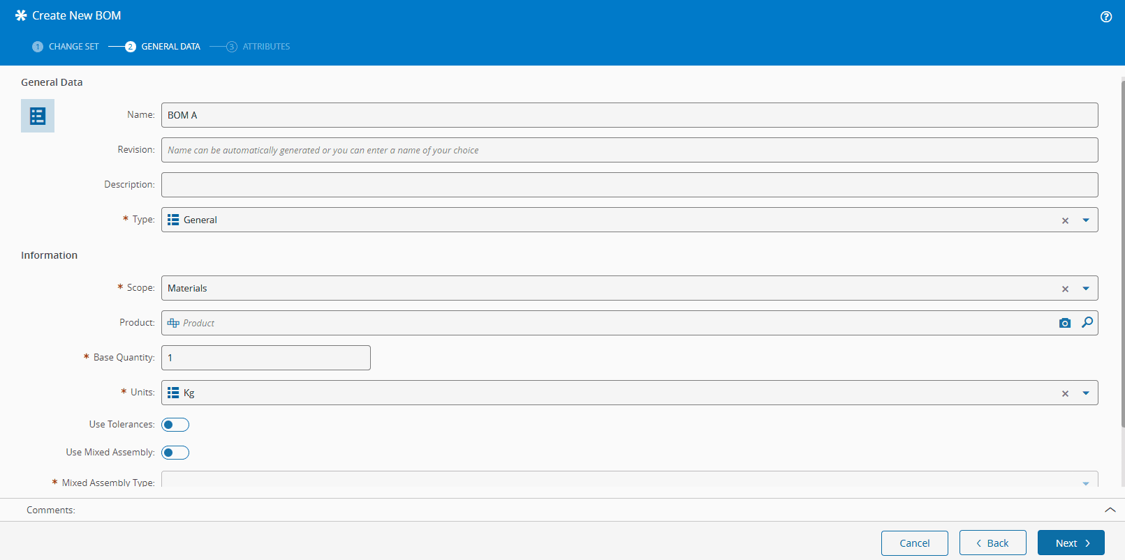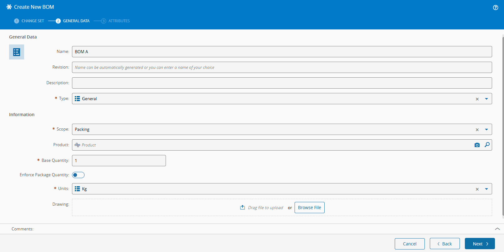 - Product - the selected Product will allow you to link the BOM to that specific Product and to reuse the Product CAD, Drawing, and Schematic files.