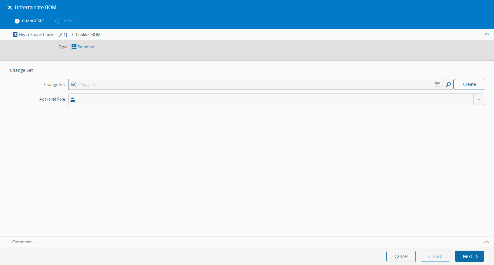 1. Select an existing Change Set or select Create to create a new Change Set. If configured to support implicit Change Sets, it is also possible to check the option Use Automatic Change Set.
