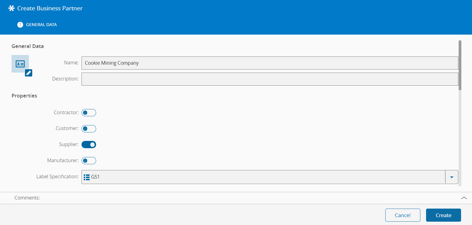 8. Select Create to complete the operation and the new Business Partner will be created.