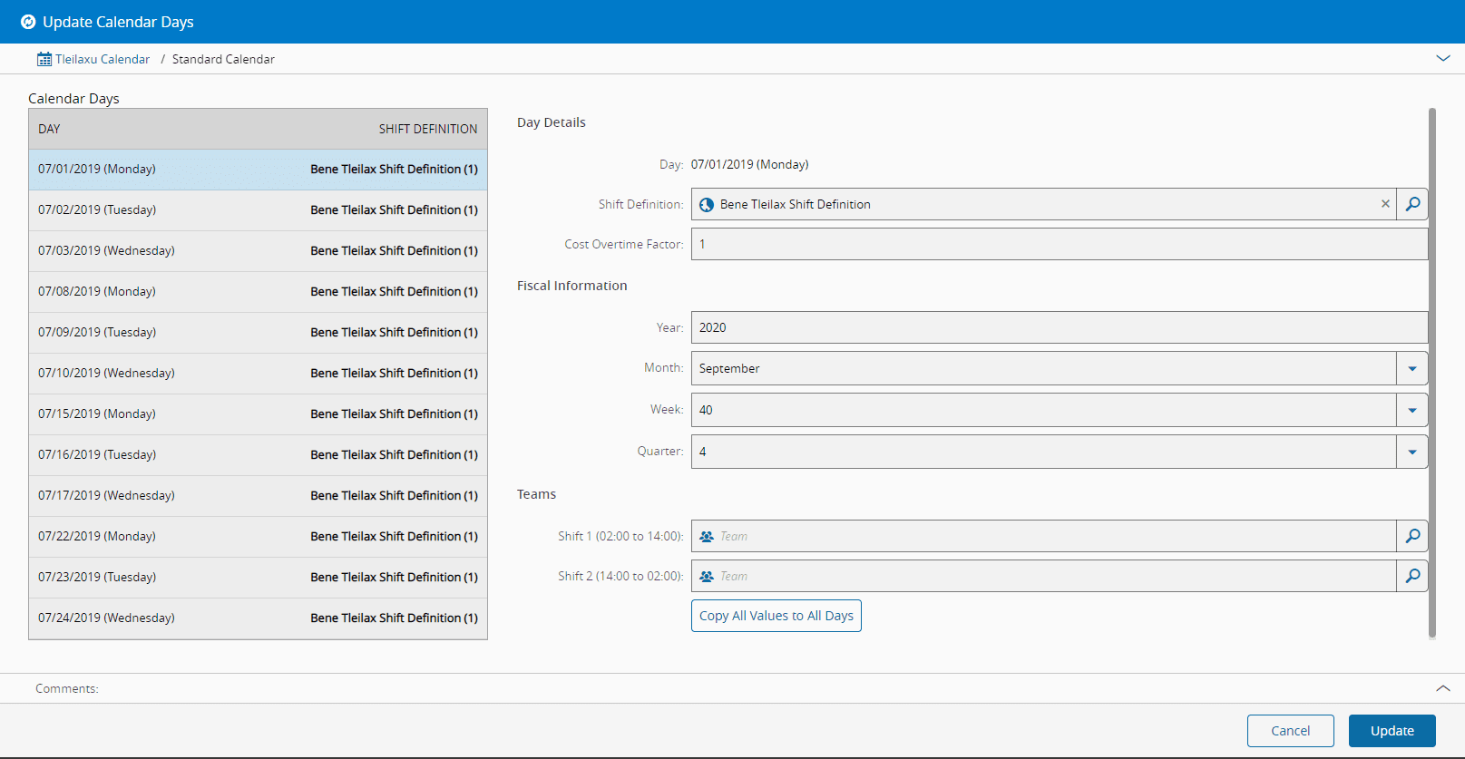 8. Select Update to complete the operation and the Calendar Days will be updated.