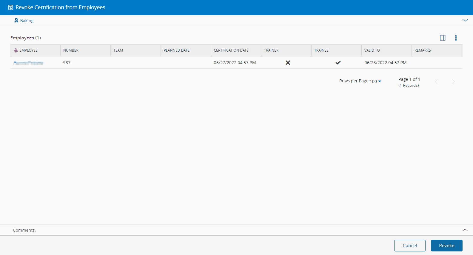 To revoke a Certification from one or more Employees, select the Employees that should have the Certification revoked and select the Revoke button in the Employees section of the page.