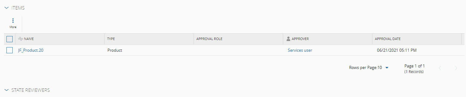 • Items - displays the Change Set Items in a list in which it will be possible to visualize the name of the Change Set Item, its type, the approval role or the name of the approver in charge of approving the item. In case the Change Set Item has already been approved, it will also be possible to see its approval date and time.