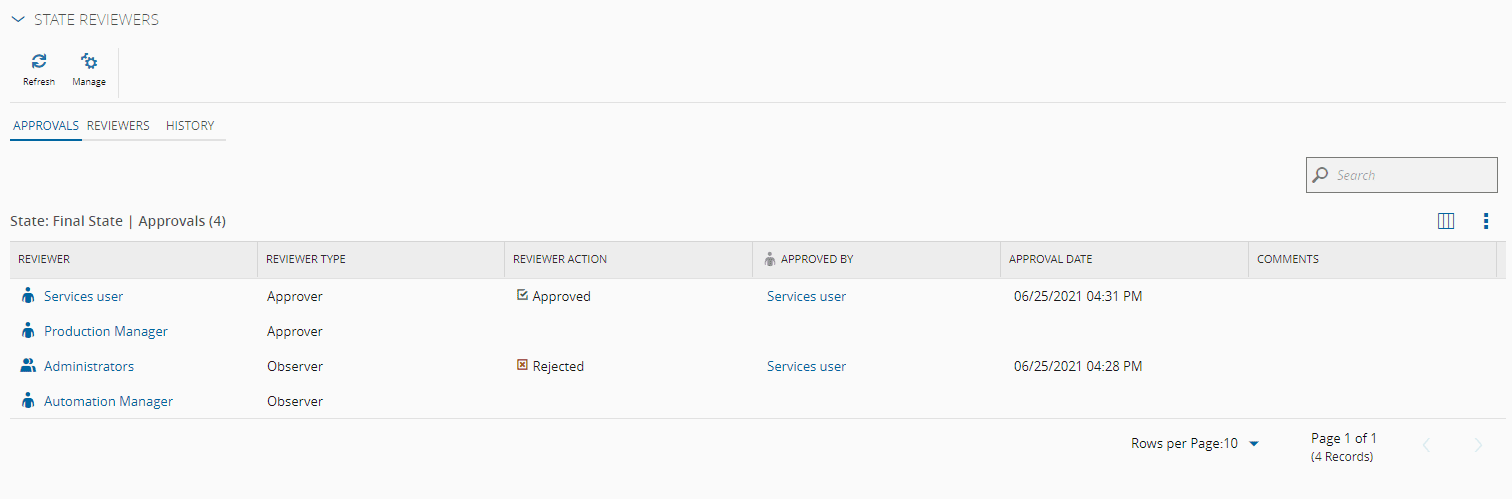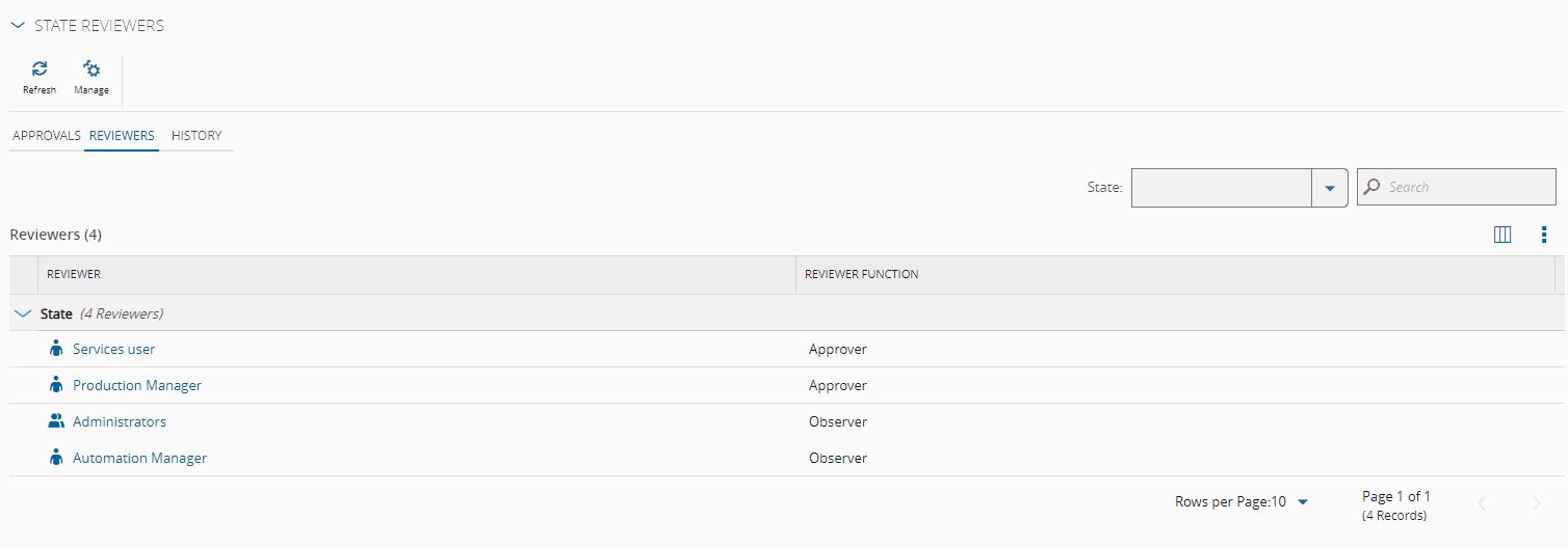 • State Reviewers - displays the Change Set Reviewers associated to this Change Set. The Reviewer must explicitly approve the Change Set at a certain state. Within this view there are three separate tabs with information on the current state review process: