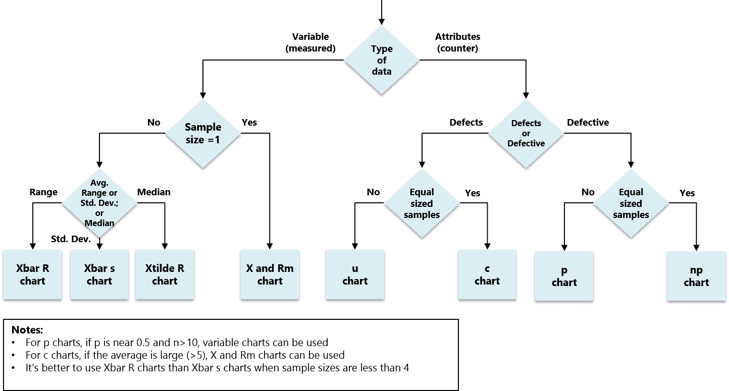 | Fraction Defective (p) | Attributes | Independent | Variable usually ≥ 50 | Binomial | Large (≥1.5σ) |