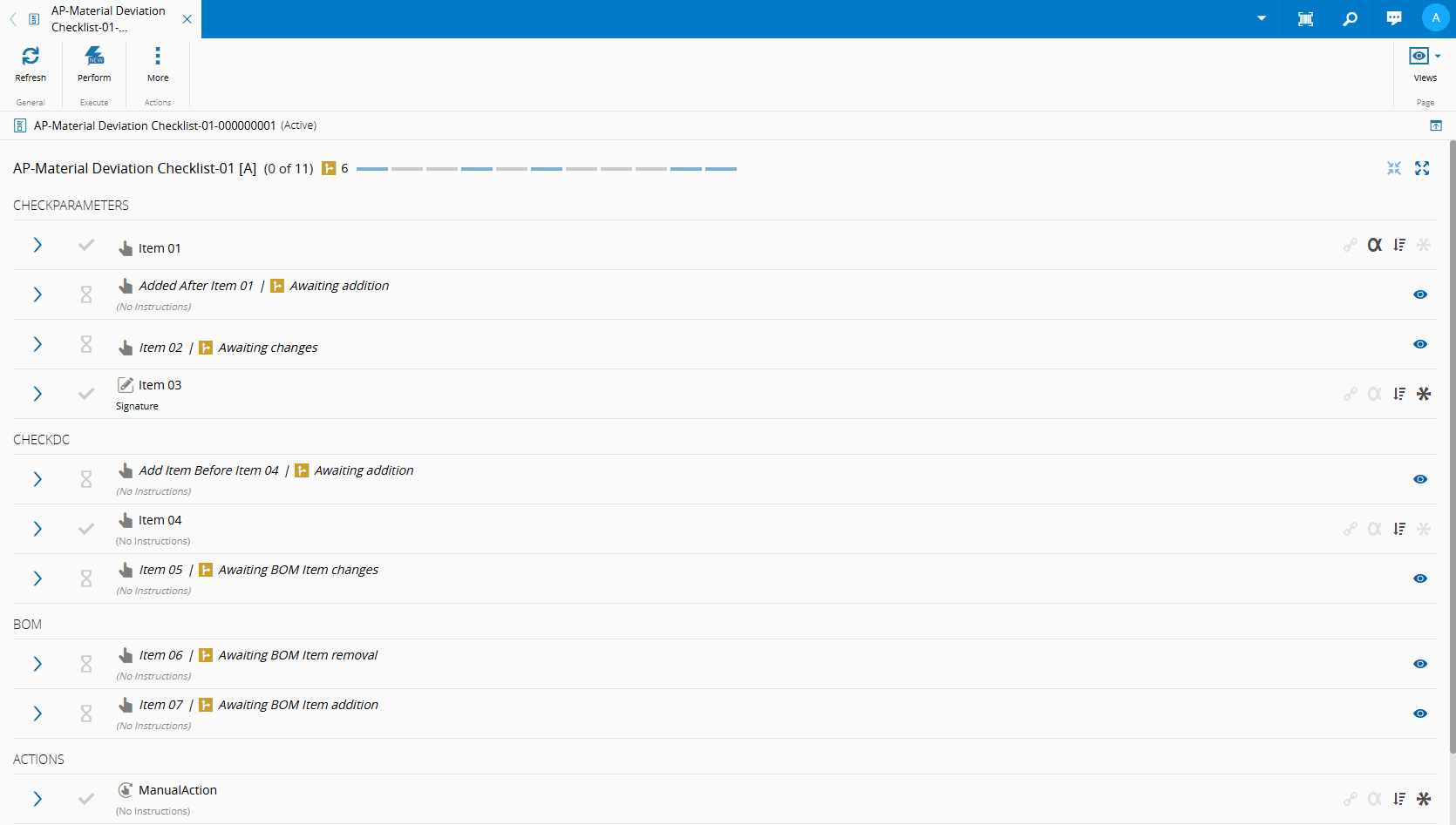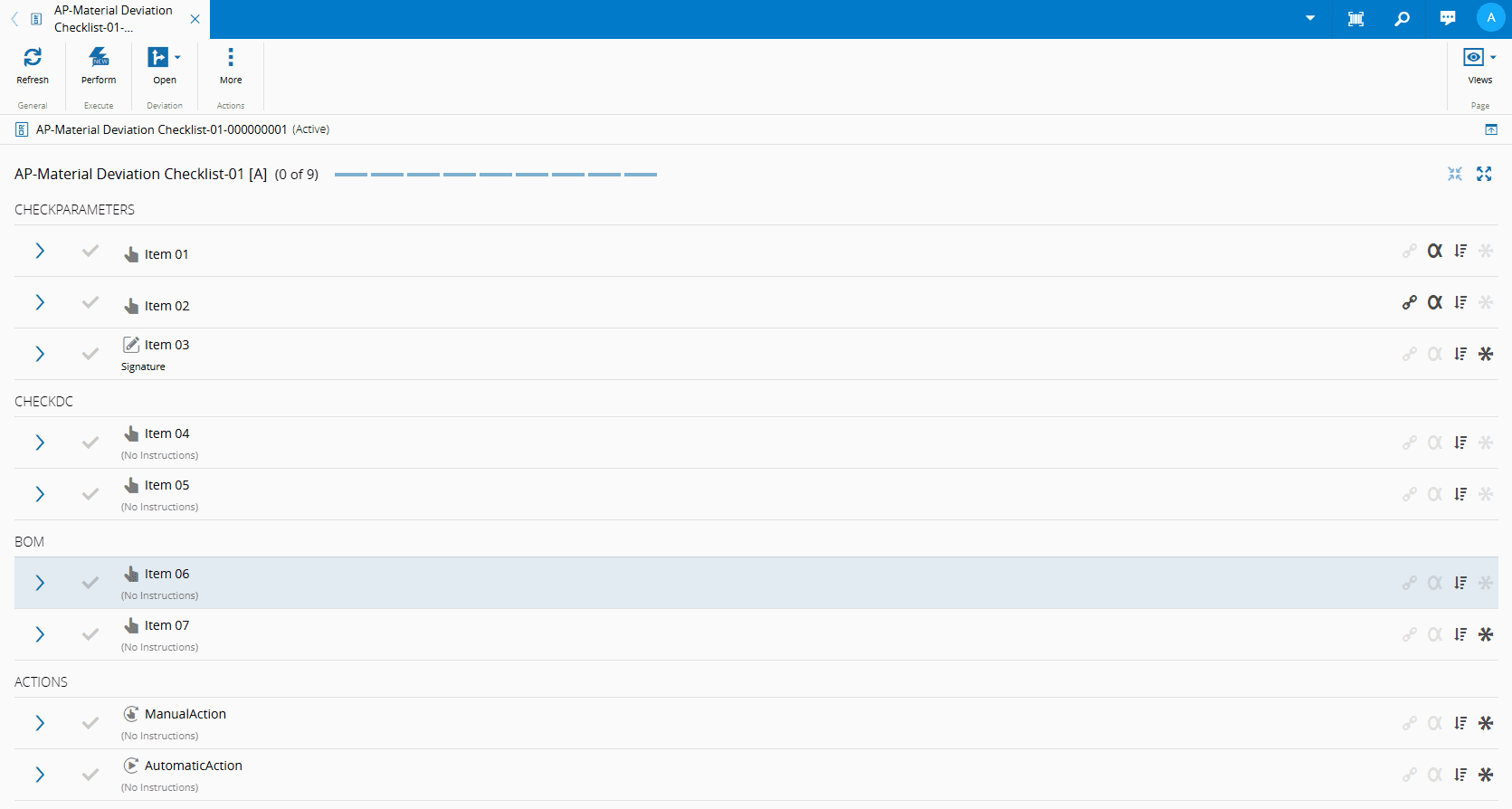 Matching the conditions above, from your Checklist, create/open a Checklist Instance for a Material. Go to your Checklist Instance and: