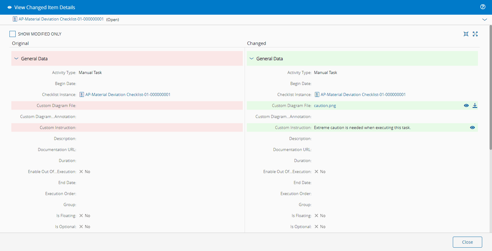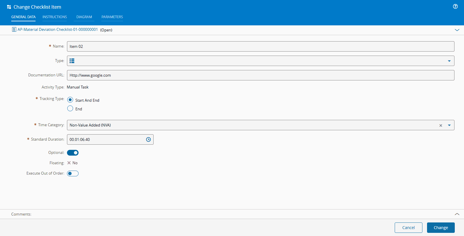 If you change (Change Item) the selected Checklist Instance Item, a new Checklist Instance Item is created based on the selected one. This option is similar to Add Item Before/Add Item After operation, except that it starts with a pre-filled Checklist Item: