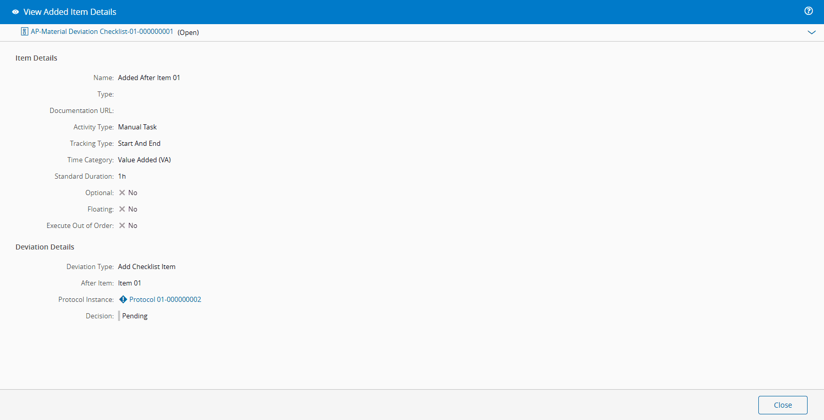 - If the Deviation Type is Add Checklist Item, the base Checklist Instance Item must have the property Is Floating set to