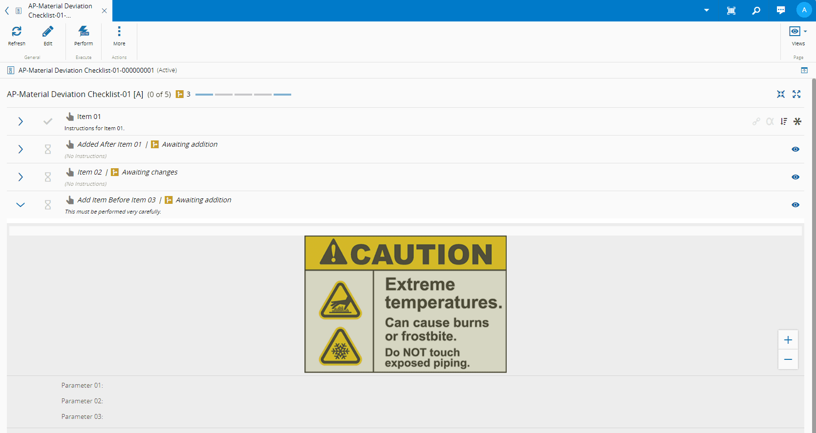 - If the Deviation Type is Change Checklist Item or Remove Checklist Item, the state must not be Started. Additionally, there must be no Data Collection posted or BOM Part consumed for that Checklist Instance Item.