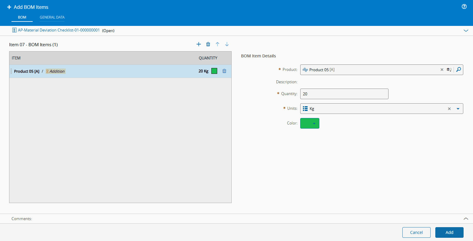- If the Deviation Type is Add BOM Item, the associated Checklist Instance must have a BOM Instance associated with it.