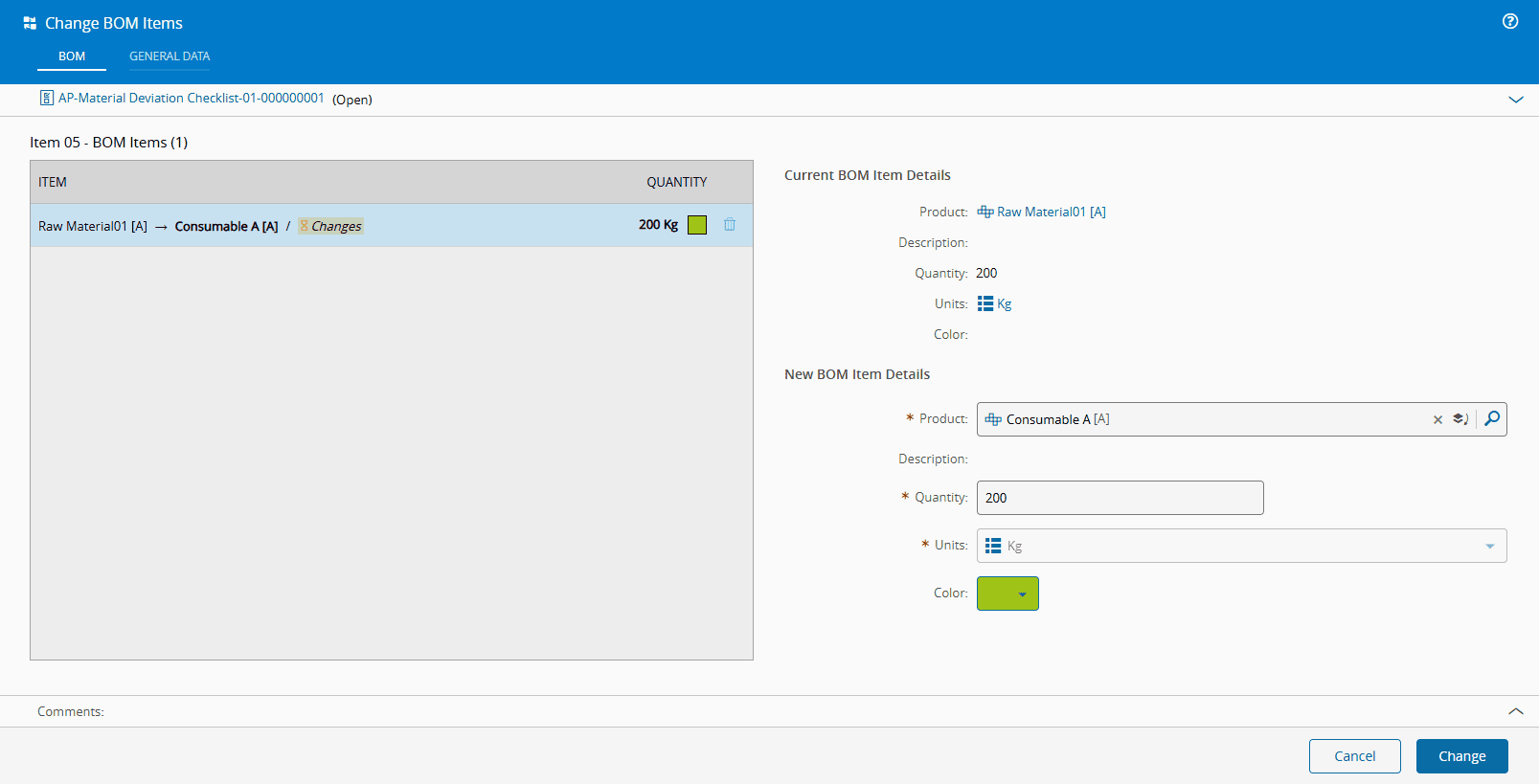 If you Change BOM Items, you can specify a new Product, a new Quantity, new Units and optionally a new Color: