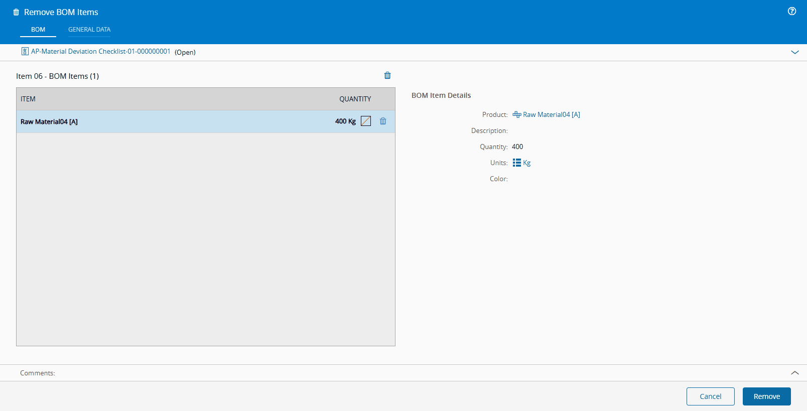 - If the Deviation Type is Change BOM Item or Remove BOM Item: