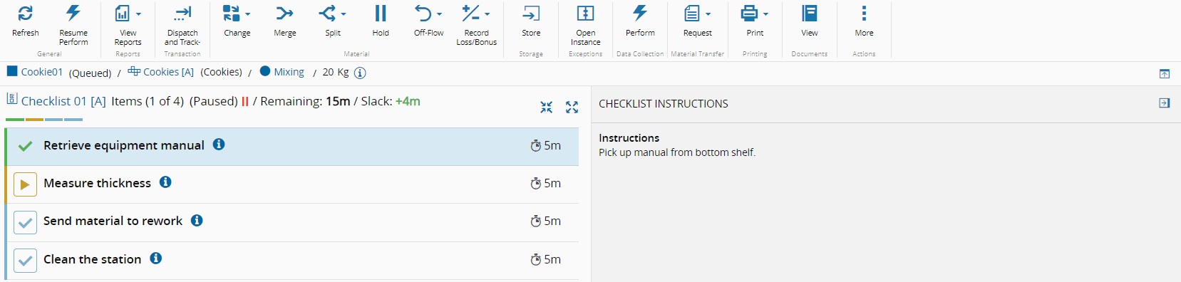 Screenshot showing a resume checklist instance with highlighted "Resume Perform" button on the top ribbon.