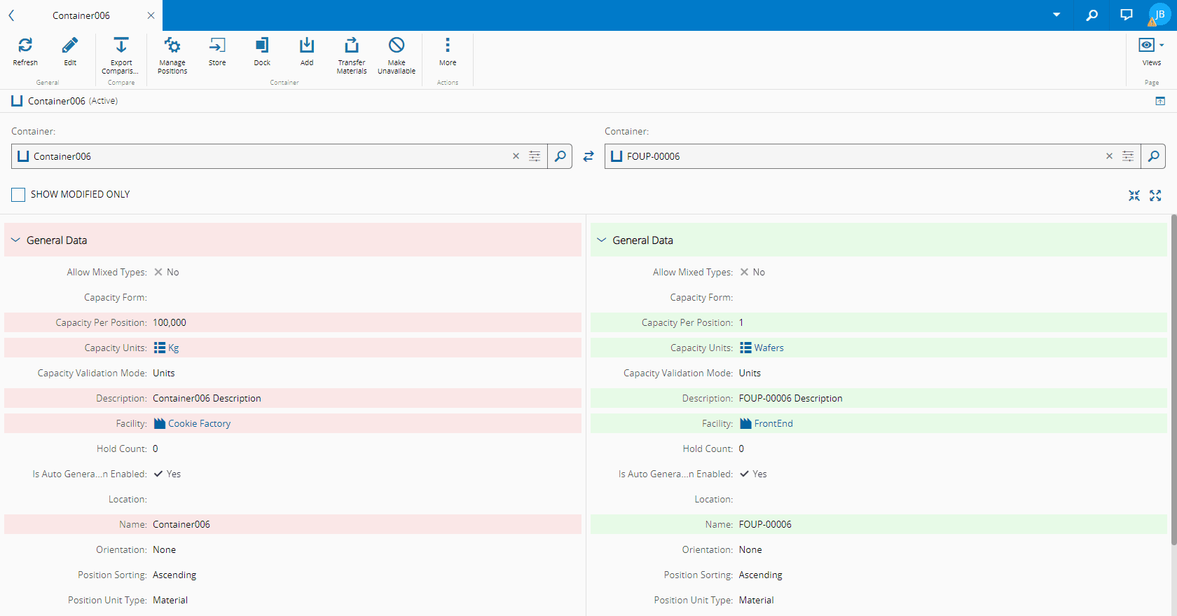 This view provides a quick visual comparison between the selected entity version and any other version that can be selected through it. You can also export the comparison results to a PDF file through the Export Comparison button on the top ribbon. For more information, see Compare Entity Versions.