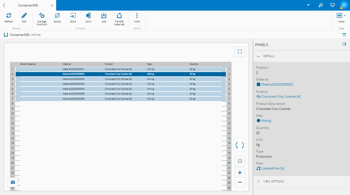 For Containers of PositionUnitType Material, a top-down view of the Container is made available to the user, displaying all the storage positions of the Container, including information on the stored Materials for each position. The user can zoom and drag the visualization and select each of the positions that are shown in grid form, with the pertinent information being displayed on the right-hand panel.